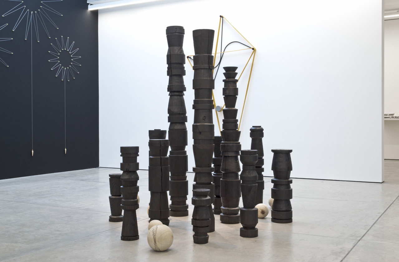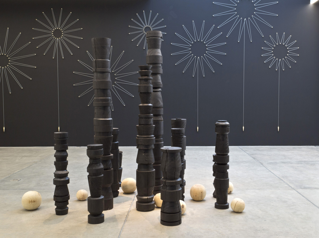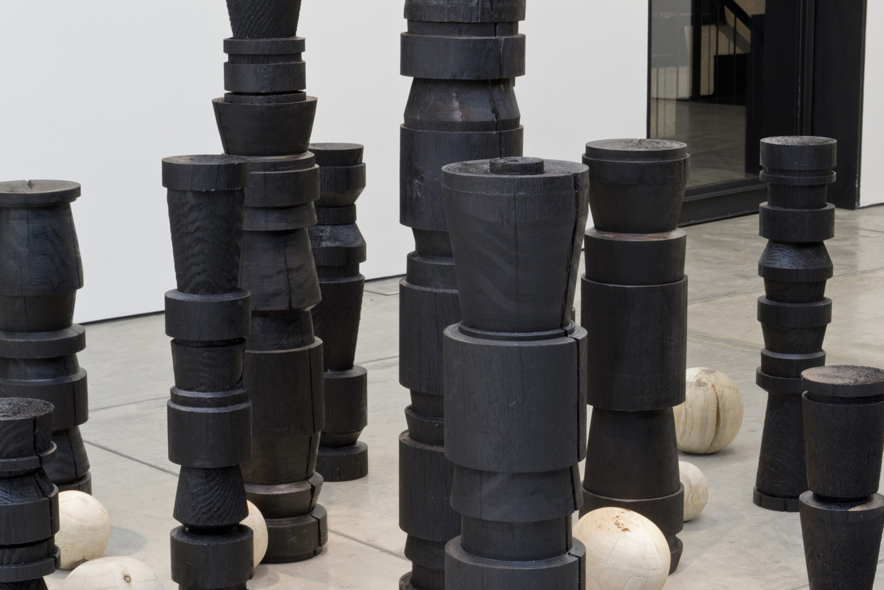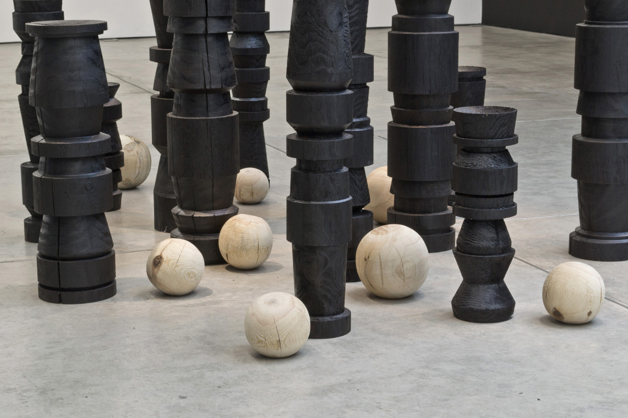 turned pine and ash with asphalt, 168 cm high, 25 pieces, variable measures, 2019