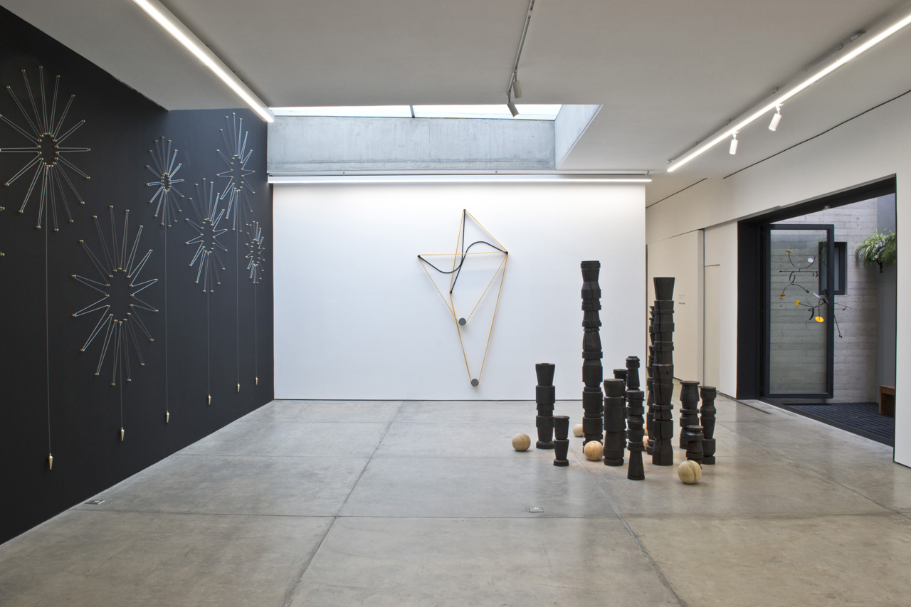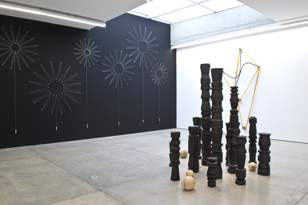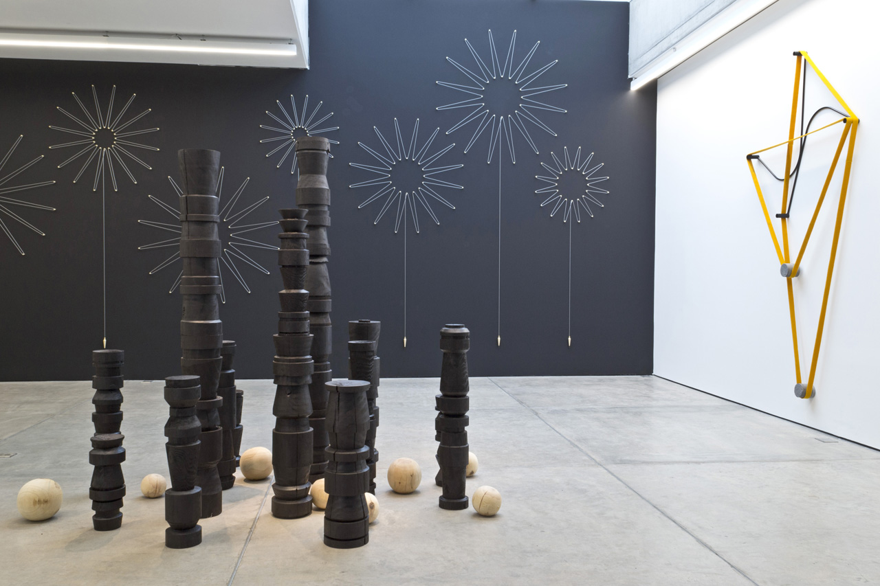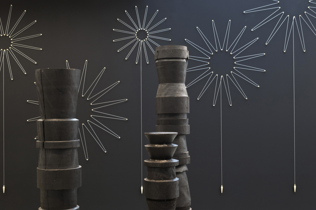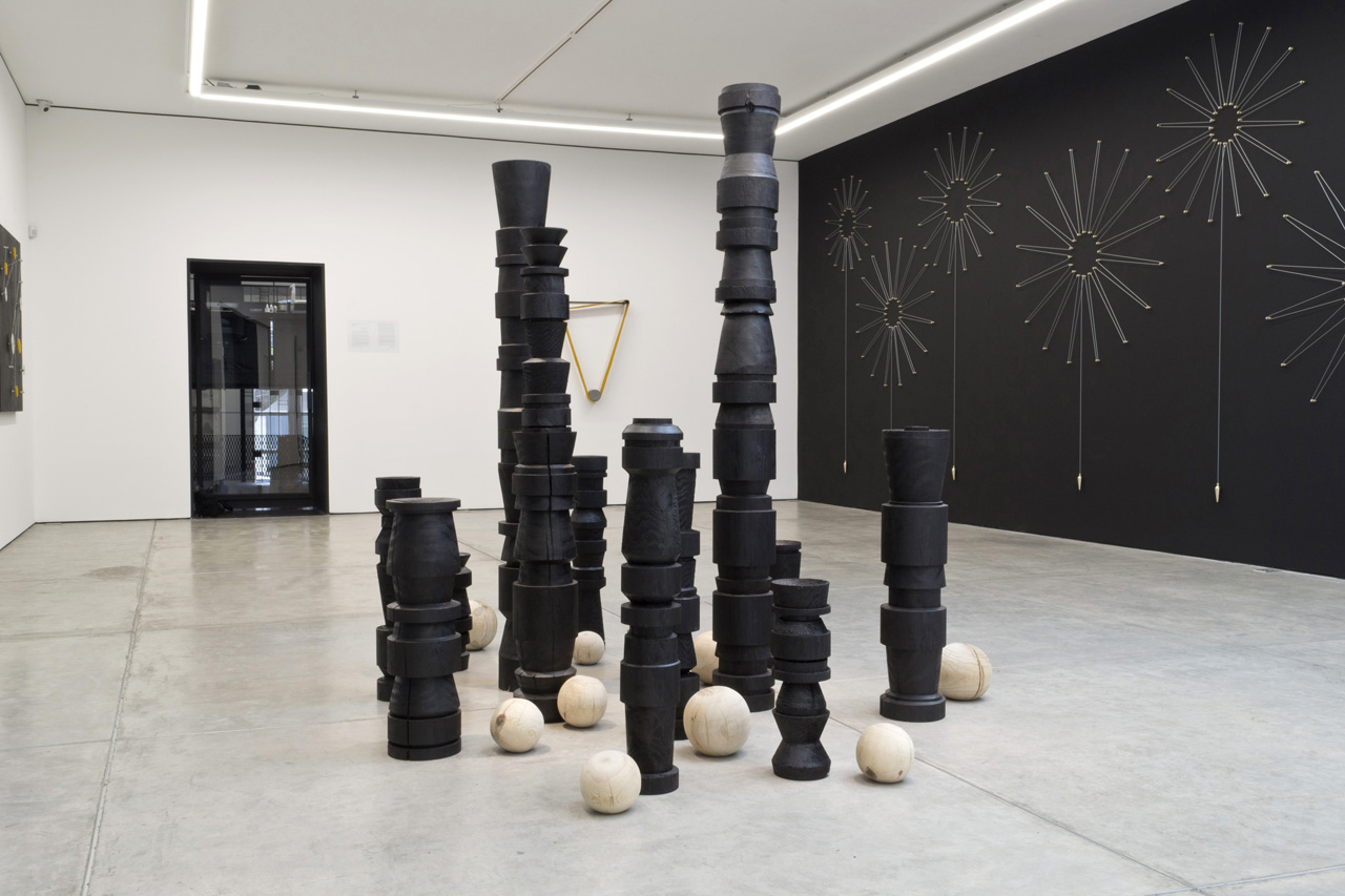 turned pine and ash with asphalt, 168 cm high, 25 pieces, variable measures, 2019