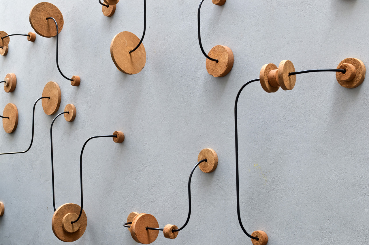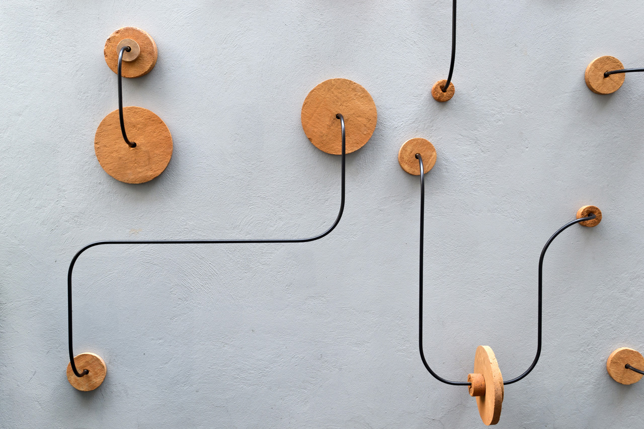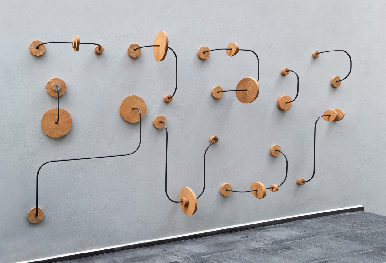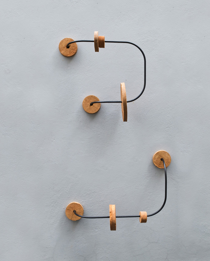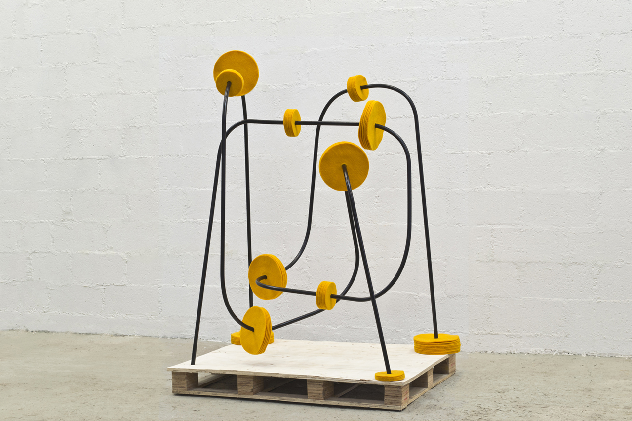 Interactive sculpture for pronation movement with iron bars and industrial felt